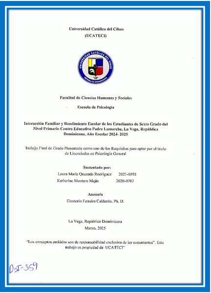Interacción familiar y rendimiento escolar de los estudiantes de sexto grado del nivel primario Centro Educativo Padre Lamarche, La Vega, República Dominicana, año escolar 2024-2025 / Laura María Quezada Rodríguez, Katherine Montero Mejía; asesor Eleuterio Ferreira Calderón