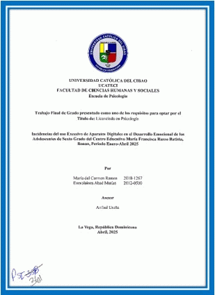 Incidencias del uso excesivo de aparatos digitales en el desarrollo emocional de los adolescentes de sexto grado del Centro Educativo María Francisca Russo Batista, Bonao, periodo enero-abril 2025 / María del Carmen Ramos, Enerolaines Abad Matías; asesor Aníbal Ureña