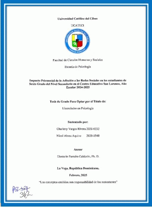 Impacto psicosocial de la adicción a las redes sociales en los estudiantes de sexto grado del nivel secundario en el Centro Educativo San Lorenzo, año escolar 2024-2025 / Charleny Vargas Rivera, Nicol Abreu Aquino: asesor Eleuterio Ferreira Calderón