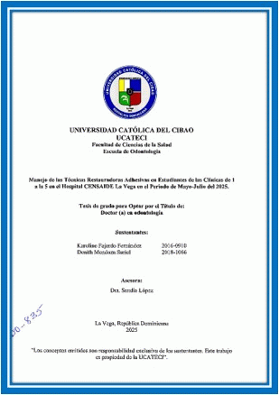 Manejo de las técnicas restauradoras adhesivas en estudiantes de las clínicas de 1 a la 5 en el Hospital CENSAIDE La Vega en el periodo de mayo-julio del 2025 / Karoline Fajardo Fernárdez, Denith Mendoza Suriel; asesor Sandia López