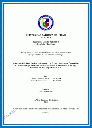Condición de salud oral en pacientes de 12 a 25 años con aparatos ortopédicos u ortodónticos que asisten a consultas en clínicas de Ortodoncia en La Vega durante el período mayo-junio 2025 / Camila Florentino Veloz, Karina Ruiz Guerrero; asesor Sandia López