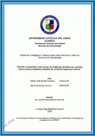 Estudio comparativo entre el uso de implante dentales de conexión cónica versus implantes dentales de conexión hegaxonal interna / María José Morilla Almonte, David Almanzar Herrera; asesor Luis Enrique García Jiménez
