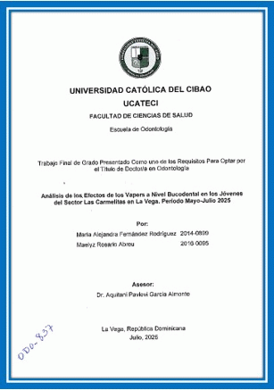 Análisis de los efectos de los vapers a nivel bucodental en los jóvenes del sector Las Carmelitas La Vega. Período mayo-julio 2025 / María Alejandra Fernández Rodríguez, Maelyz Rosario Abreu; asesor Aquitani Pavlovi Garcia Almonte