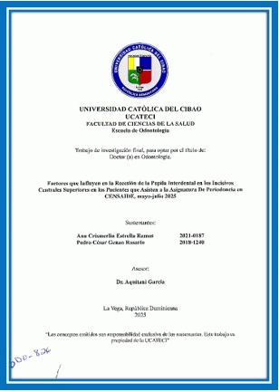 Factores que influyen en la recesión de la papila interdental en los incisivos centrales superiores en los pacientes que asisten a la asignatura de periodoncia en CENSAIDE, mayo-julio 2025 / Ana Crismerlin Estrella Ramos, Pedro César Genao Rosario; Aquitaní García