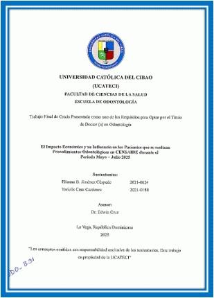 El impacto económico y su influencia en los pacientes que se realizan procedimientos odontológicos en CENSAIDE durante el período mayo-julio 2025 / Elianna B. Jiménez Céspede,Yarelis Cruz Cardenes; asesor Edwin Cruz