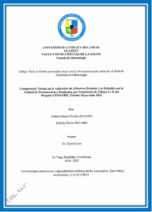 Competencia técnica en la aplicación de adhesivos dentales y su relación con la calidad de restauraciones realizadas por estudiantes de Clínica I y II del Hospital CENSAIDE, periodo mayo-julio 2025 / Francis Manuel Peralta, Rubelsy Durán; asesor Edwin Cruz