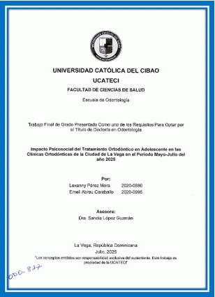 Impacto psicosocial del tratamiento ortodóntico en adolescente en las Clínicas Ortodónticas de la ciudad de La Vega en el período mayo-julio del año 2025 / Lexanny Pérez Mora, Emeli Abreu Caraballo; asesor Sandia López Guzmán
