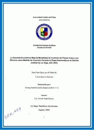 La garantía económica bajo la modalidad de contrato de fianza como y su eficacia como medida de coerción durante la etapa intermedia en el Distrito Judicial de La Vega, año 2023 / Downy Rafael Castillo Sandoval; asesor Fernan Josué Ramos