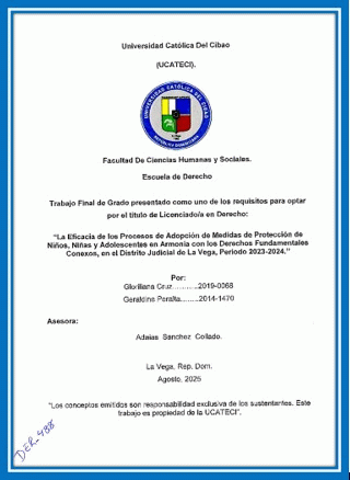 La eficacia de los procesos de adopción de medidas de protección de niños, niñas y adolescentes en armonía con los derechos fundamentales conexos, en el Distrito Judicial de La Vega, periodo 2023-2024 / Gloriliana Cruz, Geraldine Peralta; asesor Adaias Sánchez Collado