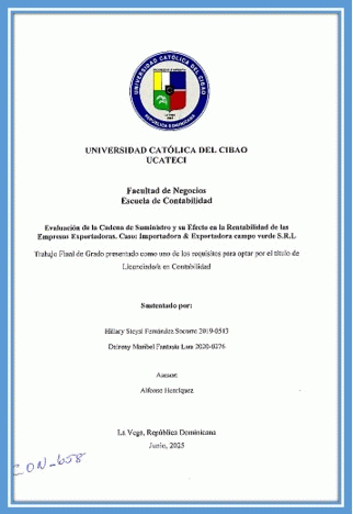 TextPublication details: La Vega : UCATECI, 2025 Description: xvi, 74 hojas; 27x21 cmSubject(s): Importadora & Exportadora Campo Verde S.R.L | Evaluación -- Investigaciones -- 2025 -- República Dominicana -- La Vega | Rentabilidad -- Investigaciones -- 2025 -- República Dominicana -- La VegaDissertation note: Tesis (Licenciado en Contabilidad). -- UCATECI. Facultad de Ciencias de Negocios. Escuela de Contabilidad, 2025