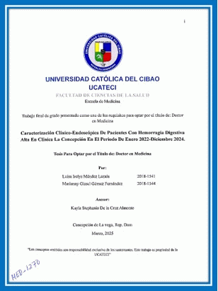 Caracterización clínico-endoscópica de pacientes con hemorragia digestiva alta en Clínica La Concepción en el periodo de enero 2022-diciembre 2024 / Luisa Irelys Méndez Lazala, Marianny Gissel Gómez Fernández, asesor Kayla Stephania De La Cruz Almonte