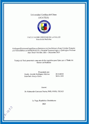 Hallazgos electrocardiográficos en pacientes con insuficiencia renal crónica tratados con hemodiálisis en NEFROSALUD y Hospital Traumatológico y Quirúrgico Prof. Juan Bosch Periodo: Julio-Diciembre 2024 / Ruddy Arnelle Rodriguez Adames, Jean Luis Araujo Abreu; asesor Raimundo Carmona Puerta
