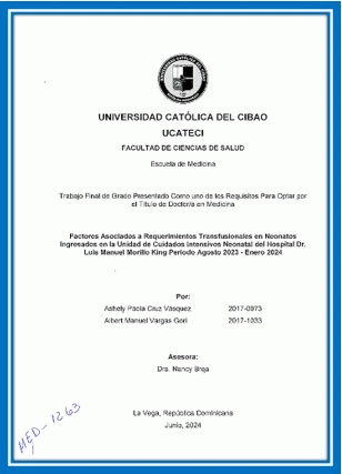 Factores asociados a requerimientos transfusionales en neonatos ingresados en la Unidad de Cuidados Intensivos Neonatal del Hospital Dr. Luis Manuel Morillo King Periodo agosto 2023 - enero 2024 / Ashely Paola Cruz Vásquez, Albert Manuel Vargas Gori; asesor Nancy Brea