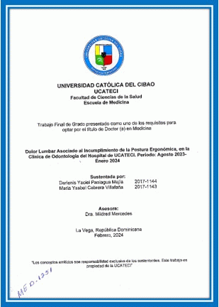 Dolor lumbar asociado al incumplimiento de la postura ergonómica, en la Clínica Odontología del Hospital de UCATECI. Periodo: agosto 2023 - enero 2024 / María Ysabel Cabrera Villafaña; asesor Mildred Mercedes