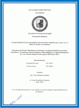 Deterioro del estado nutricional en pacientes con enfermedad renal cronica sometidos a tratamientos renal sustitutivo (Hemodiálisis) en el Hospital Regional Dr. Luis Morillo King. Periodo agosto 2023-enero 2024 / Esmerlin De León, Yulivee López; asesor Veter Betania Custodio