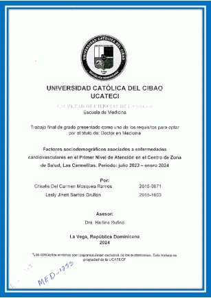 Factores sociodemográficos asociados a enfermedades cardiovasculares en el primer nivel de atención en el Centro de Zona de Salud, Las Carmelitas. Periodo: julio 2023 - enero2024 / Crisalis Del Carmen Mosquea Ramos, Lesly Jinett Santos Grullón; asesor Harline Rufino