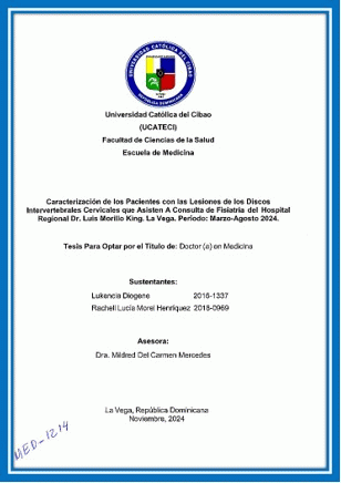 Caracterización de los pacientes con las lesiones de los discos intervertebrales cervicales que asisten a consulta de fisiatría del Hospital Regional Dr. Luis Morillo King. La Vega. Periodo: marzo-agosto 2024 / Lukencia Diogene, Rachell Lucia Morel Henríquez; asesor Mildred Del Carmen Mercedes