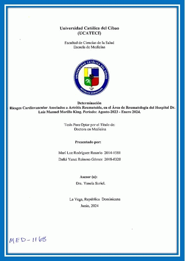Determinación de riesgos cardiovascular asociados a artritis reumatoide, en el área de reumatología del Hospital Dr. Luis Manuel Morillo King. Período: agosto 2023 - enero 2024 / Mari Luz Rodríguez Rosario, Daiki Yanet Reinoso Gómez; asesor, Yanela Suriel,