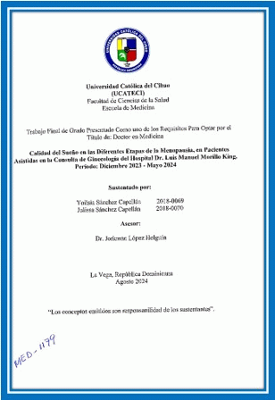 Calidad del sueño en las diferentes etapas de la menopausia, en pacientes asistidas en la consulta de ginecología del Hospital Dr. Luis Manuel Morillo King. Periodo: Diciembre 2023 - Mayo 2024 / Yoilsia Sánchez Capellán, Julissa Sánchez Capellán; asesor Jorkman López Holguín