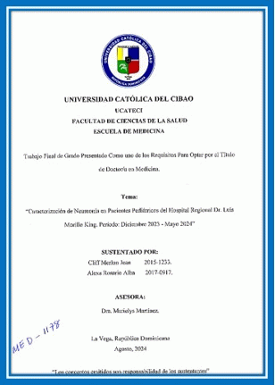 Caracterización de neumonía en pacientes pediátricos del Hospital Regional Dr. Luis Manuel Morillo King. Período: diciembre 2023 - mayo 2024 / Cliff Merlon Jean, Alexa Rosario Alba; asesor, Marielys Martínez