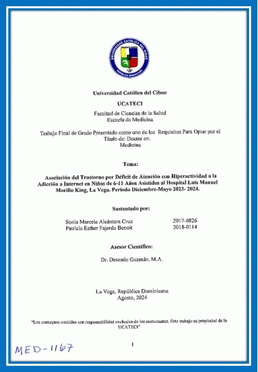 Asociación del trastorno por déficit de atención con hiperactividad a la adicción a internet en niños de 6-11 años asistidos al Hospital Dr. Luis Manuel Morillo King, La Vega. Periodo diciembre-mayo 2023- 2024 / Sonia Marcela Alcántara Cruz, Patricia Esther Fajardo Benoit; asesor, Deseado Guzmán