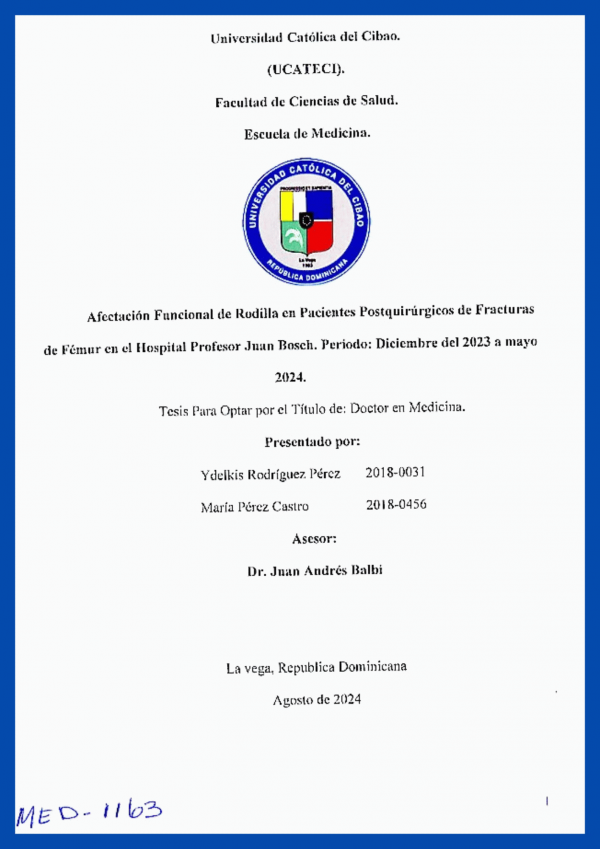 Afectación funcional de rodilla en pacientes postquirúrgicos de fracturas de fémur en el Hospital Profesor Juan Bosch. Periodo: diciembre del 2023 a mayo 2024 / Ydelkis Rodríguez Pérez, María Pérez Castro; asesor, Juan Andrés Balbi