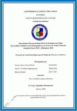 Alteraciones electrocardiográficas en pacientes con dolor precordial atendidos en la emergencia de un Centro de Primer Nivel de atención enero 2023 - diciembre 2024 / Sarah Leticia Abreu Marte, Darah Liz Nuñez Nepomuceno, Dred de Moya; asesor Elizabeth Lorenzo Martínez
