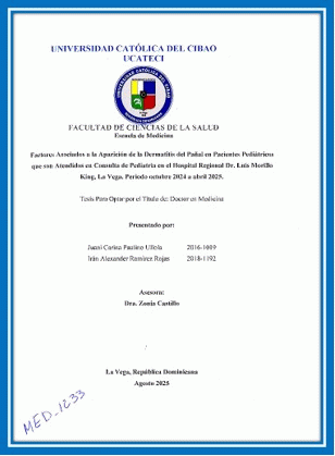 Factores asociados a la aparición de la dermatitis del pañal en pacientes pediátricos que son atendidos en consulta de pediatría en el Hospital Regional Dr. Luis Morillo King, La Vega. Periodo octubre 2024 a abril 2025 / Juani Carina Paulino Ullola, Irán Alexander Ramirez Rojas; asesor Zonia Castillo