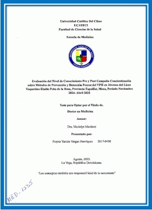 Evaluación del nivel de conocimiento pre y post campaña concientización sobre métodos de prevención y detección precoz del VPH en jóvenes del Liceo Vespetino Eladio Peña de la Rosa, Provincia Espaillat, Moca, período noviembre 2024 - abril 2025 / Fraysa Yaritza Vargas Henríquez; asesor Marielys Martínez