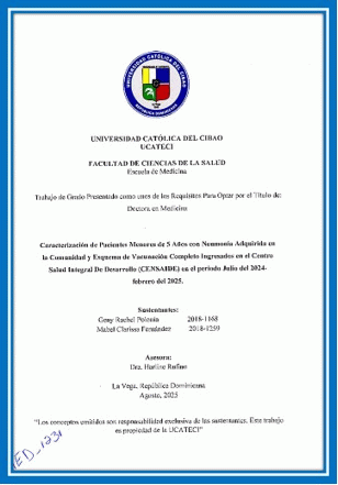 Caraterización de pacientes menores de 5 años con neumonía adquirida en la comunidad y esquema de vacunación completo ingresados en el Centro Salud Integral de Desarrollo (CENSAIDE) en el periodo julio del 2024 - febrero del 2025 / Geny Rachel Polonia, Mabel Clarissa Fernández; asesor Harline Rufino