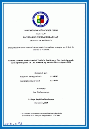 Factores asociados a la enfermedad vestibular periférica en otorrinolaringología del Hospital Regional Dr. Luis Morillo King. Periodo: marzo - agosto 2024 / Winifer Alt. Monegro Garcia, Valentina Rodríguez Conil; asesor Giselle Alvarado