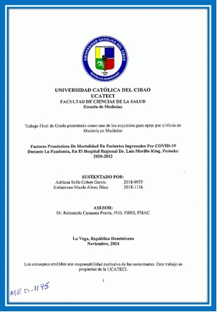 Factores pronósticos de mortalidad en pacientes ingresados por COVID-19 durante la pandemia, en el Hospital Regional Dr. Luis Morillo King. Periodo: 2020 2022 / Adrienn Sofía Cohen García, Katherinne Nicole Abreu Báez; asesor Raimundo Carmona Puerta