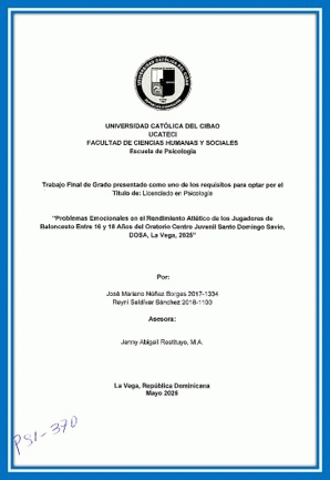 Problemas emocionales en el rendimiento atlético de los jugadores de baloncesto entre 16 y 18 años del Oratorio Centro Juvenil Santo Domingo Savio, DOSA, La Vega, 2025 / José Mariano Núñez Borges, Reyni Saldívar Sánchez; asesor Jenny Abigail Restituyo