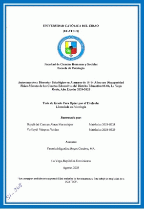 Autoconcepto y bienestar psicológico en alumnos de 10-14 años con discapacidad físico-motora de los Centros Educativos del Distrito Educativo 06-04, La Vega Oeste. Años escolar 2024-2025 / Nayeli del Carmen Abreu Marmolejos, Yarileydi Vásquez Valdez; asesor, Yesenia Miguelina Reyes Cordero