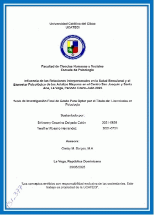 Influencia de las relaciones interpersonales en la salud emocional y el bienestar psicológico de los adultos mayores en el Centro San Joaquín y Santa Ana, periodo enero-julio 2025 / Brithanny Oscarina Delgado Colón, Yenifher Rosario Hernández; asesor Greisy M. Borges