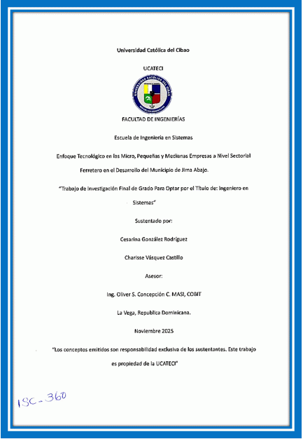Enfoque tecnológico en las micro, pequeñas y medianas empresas a nivel sectorial ferretero en el desarrollo del Municipio de Jima Abajo / Cesarina González Rodríguez, Charisse Vásquez Castillo; asesor Oliver S. Concepción C.